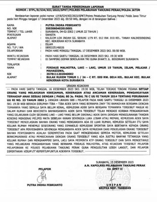 Kasus penganiayaan ini pun diterima Polres Pelabuhan Tanjung Perak Surabaya dengan nomor laporan polisi LP/B/534/XII/2023/SPKT/Polres Pelabuhan Tanjung Perak/Polda Jawa Timur, Minggu, 17 Desember 2023 sekitar pukul 00.50 WIB.
